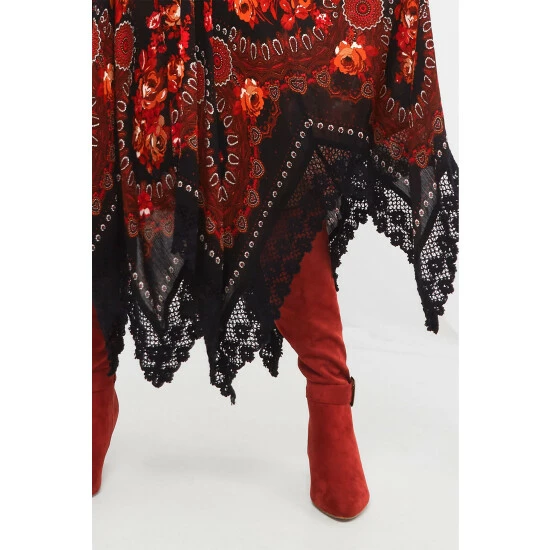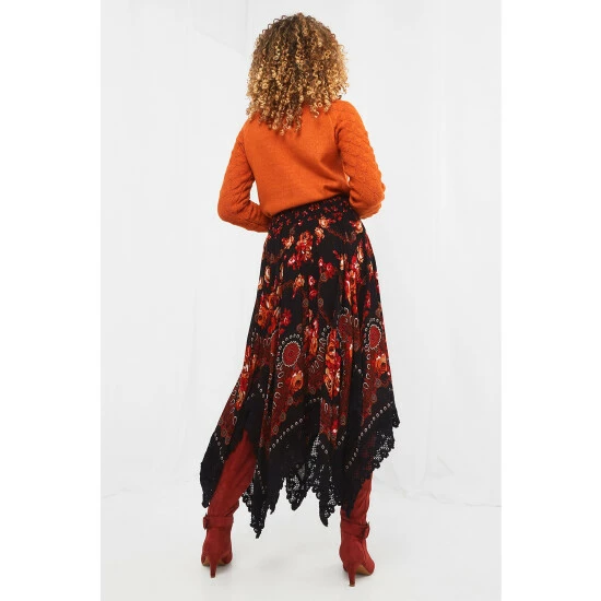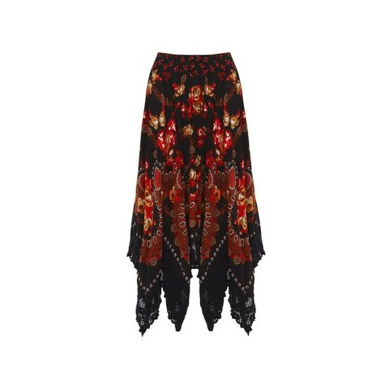 With lace trims, a rich print and handkerchief hem, this floaty skirt is all about the detail.Woven Fabric. Approx Length: 87cm.