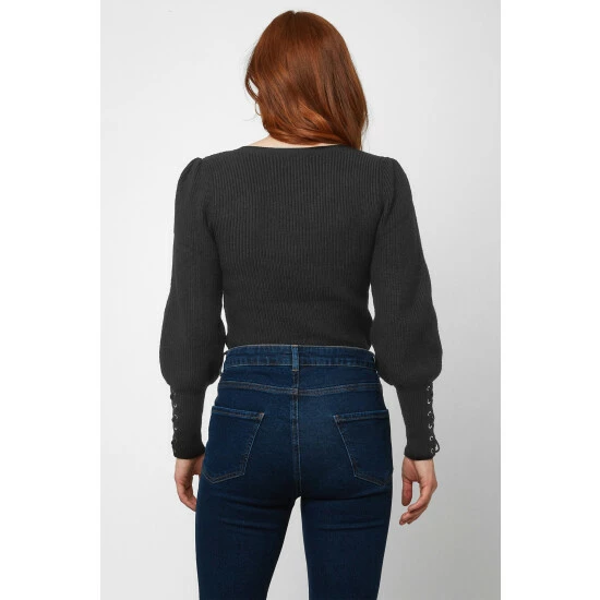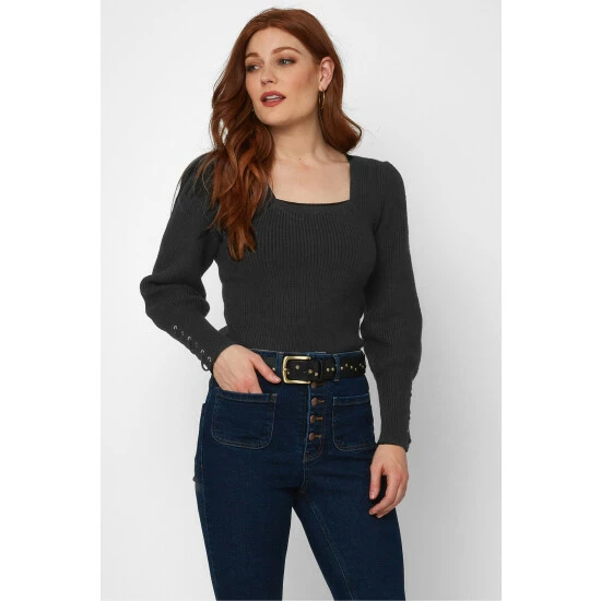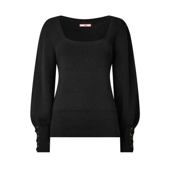 A sophisticated sweater with a square neckline and playful puffed sleeves.
