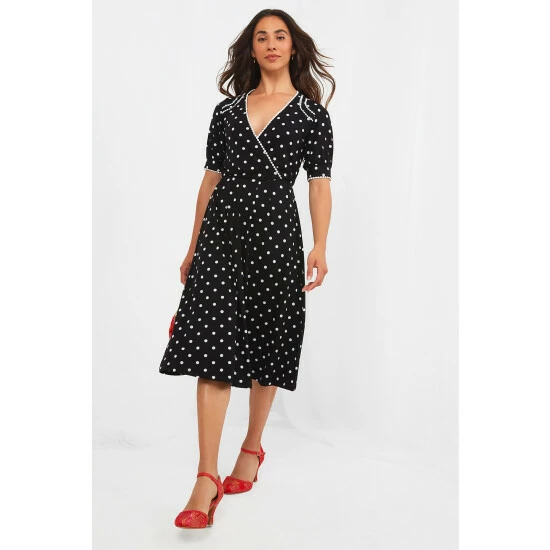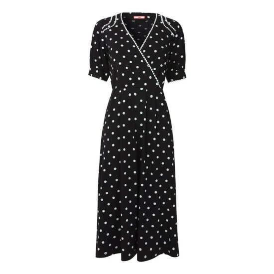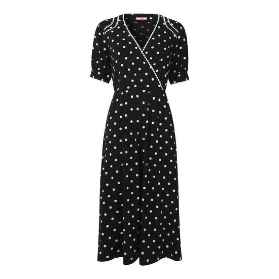 This polka dot dress really stands out from the rest, with its pleated skirt and beaded trim. Jersey Fabric. Approx Length: 110cm.